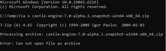 Today I downloaded the latest release of CGE “castle-engine-7.0-alpha.3.snapshot-win64-x86_64.zip” from Release Latest release of Castle Game Engine (Auto-Updated Snapshot) · castle-engine/castle-engine · GitHub . I checked the sha256 and it’s ok. But I got unpack error: