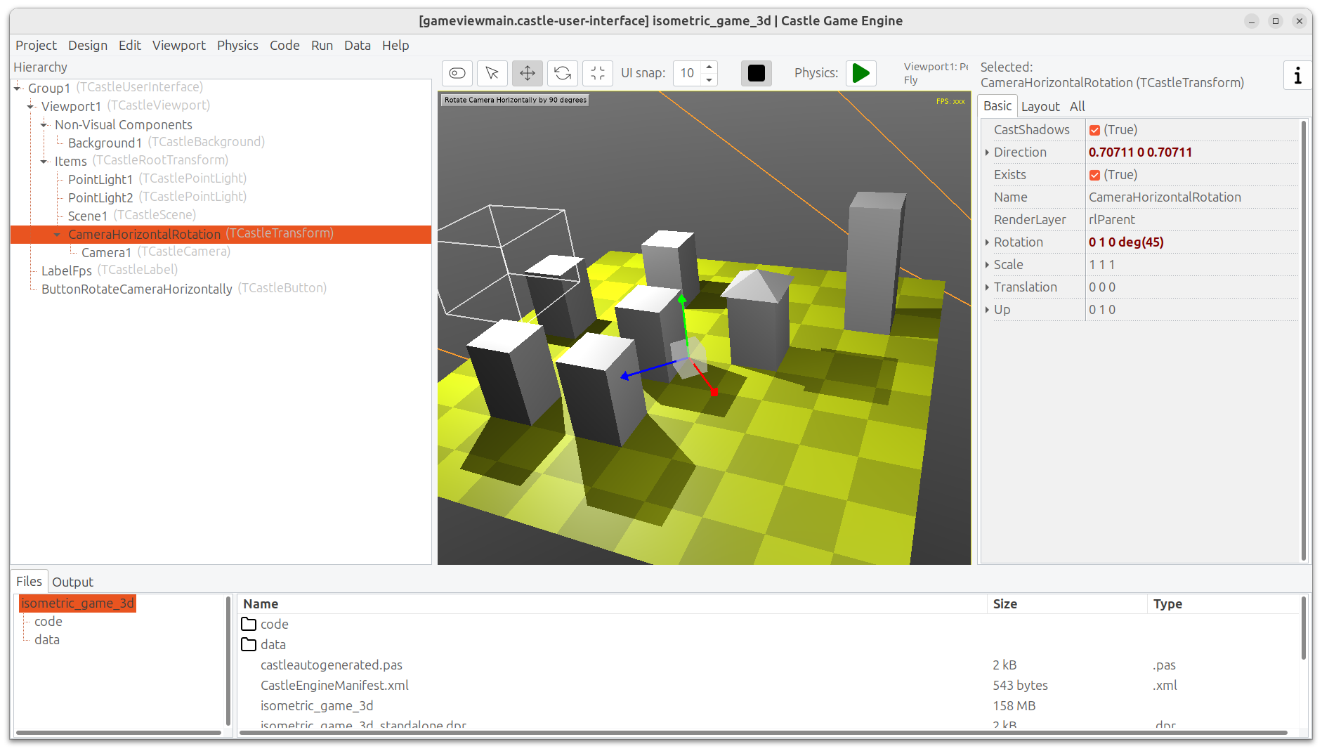 I wanted to create an isometric view, but I couldn’t find a proper way to do it, so I had to copy and paste the CameraHorizontalRotation code from the related demo into my own project.